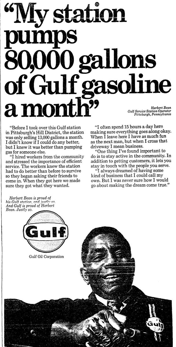 Herbert Bean purchased the gas station at Kirkpatrick and Centre from Willie Stevenson for $1,800 in 1961, using his personal car as collateral for the loan. Bean and a few friends worked the gas station in the early months, putting in 16-20 hour days and splitting the meager profits among themselves until the business was successful enough to establish payroll. That hard work soon paid off – within its first year, the station was selling six times more gasoline than under the previous owner, and Bean soon became the biggest gasoline seller in the Hill District.